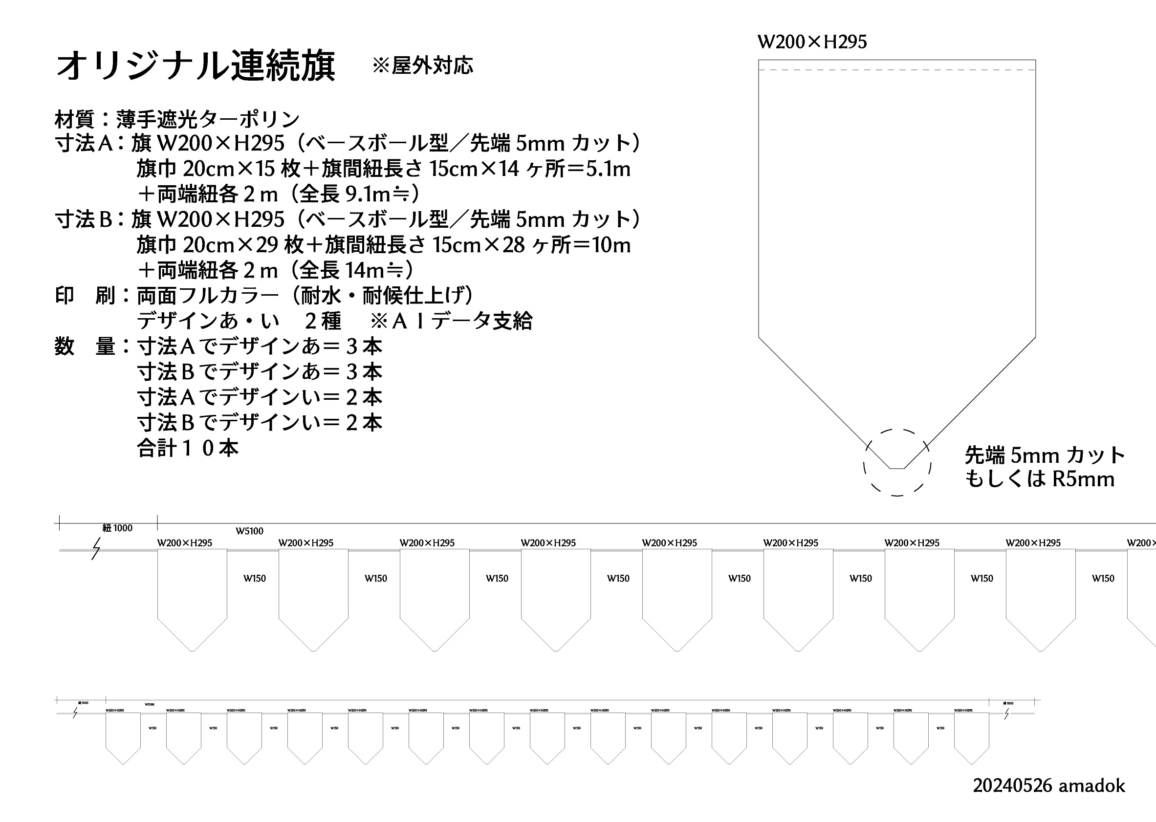 アマドック様ご注文 特注連続旗 両面印刷遮光ターポリン 全長9100㎜ 200x295x15枚 あ--3組 200x295x15枚  い--2組 全長14000㎜ 200x295x29枚 あ---3組 200x295x29枚 い---2組