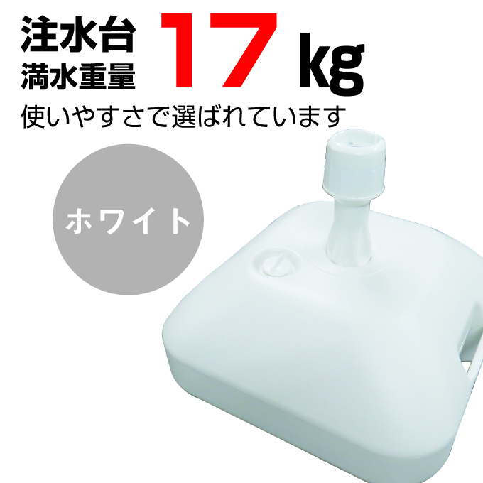 仕様 サイズ:390㎜x390㎜x320㎜ 満水時:17㎏ 対応ポール:22φ~25φ カラー:ホワイト 素材:プラスチック