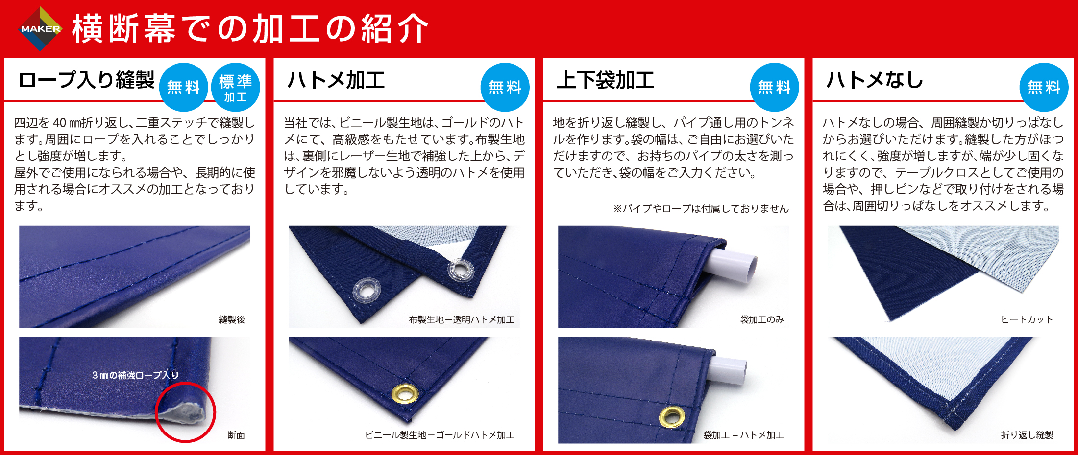 ※ポンジ・防炎ポンジはハトメ加工・上下袋加工は選択できません。