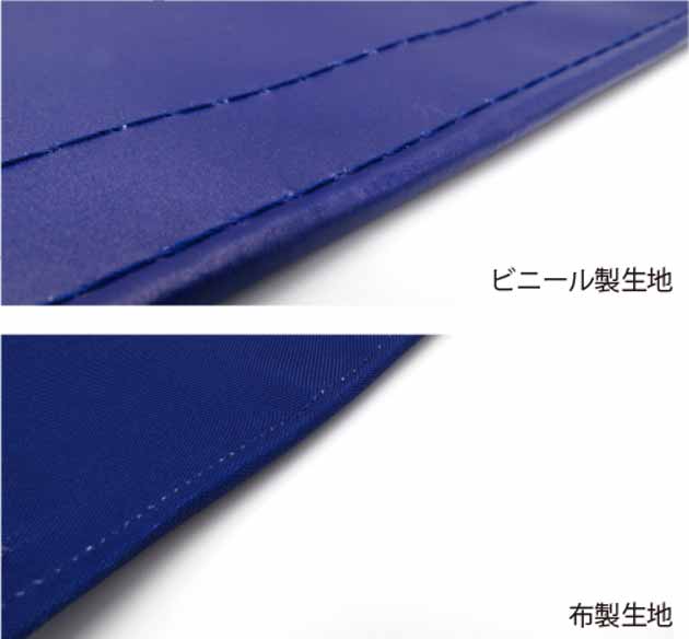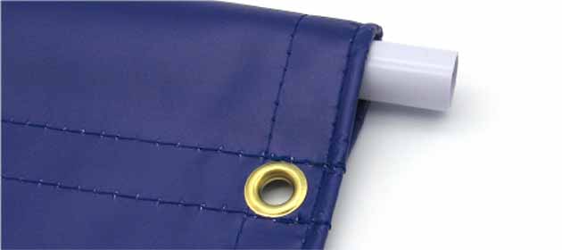 ビニール製生地はゴールド、布製生地は透明のハトメを取り付け、周囲はロープを縫いこんで補強しています。