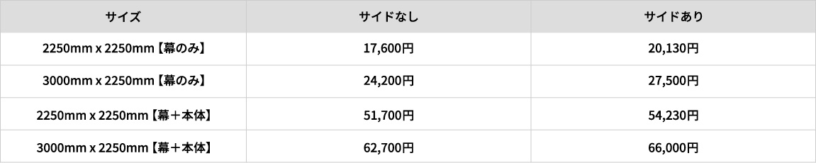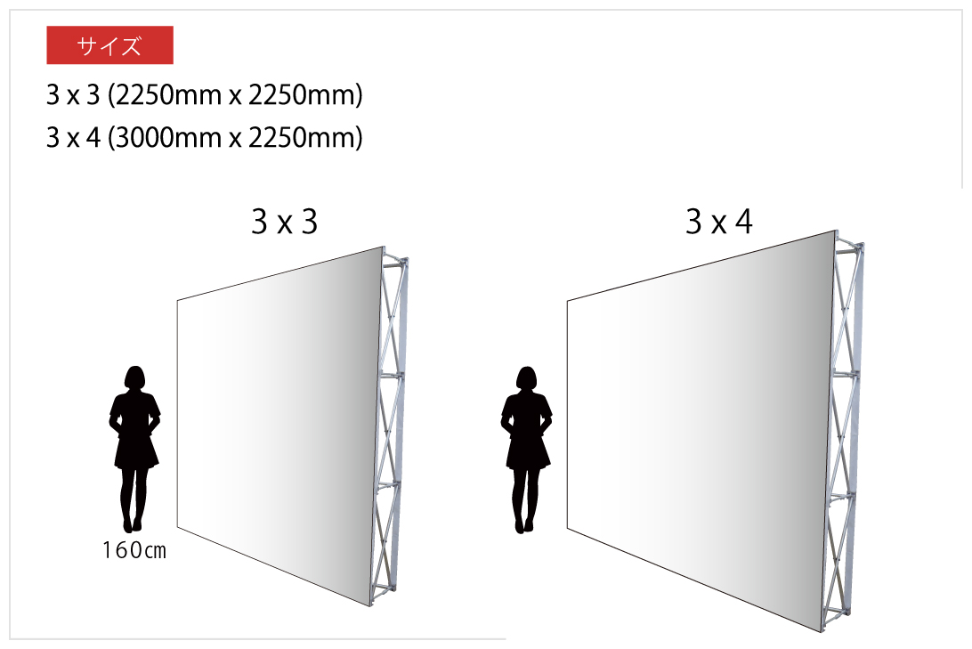 バックパネルは、3x3(2250㎜x2250㎜)、3x4(3000㎜x2250㎜)の2種類のサイズを取り扱っています。