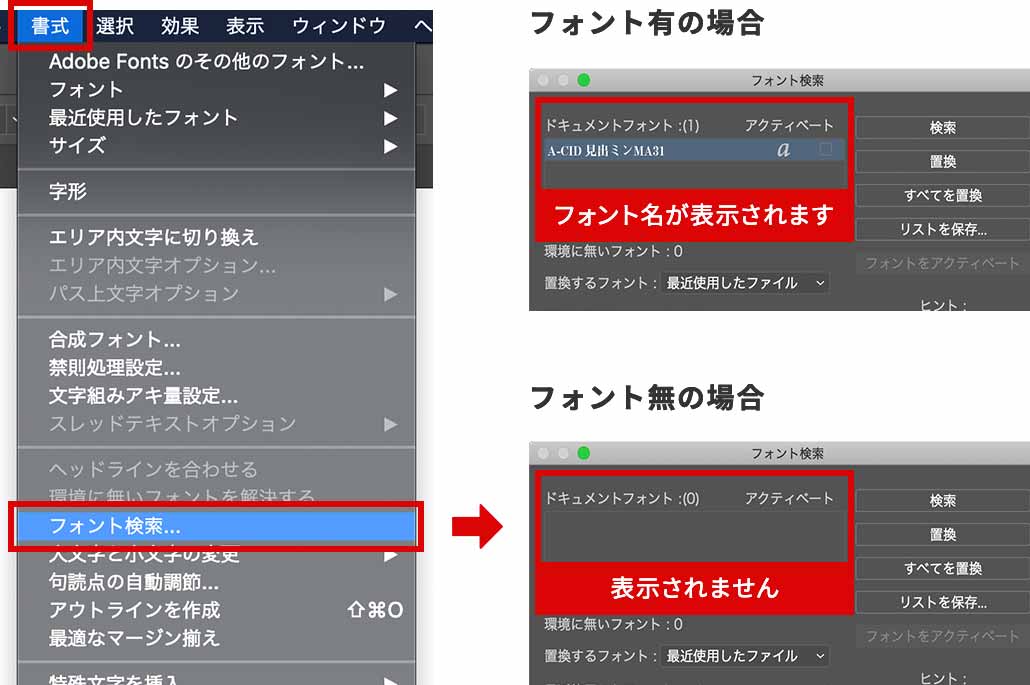 送付前に「フォントの検索」にて、全てアウトライン化されていることをご確認ください。