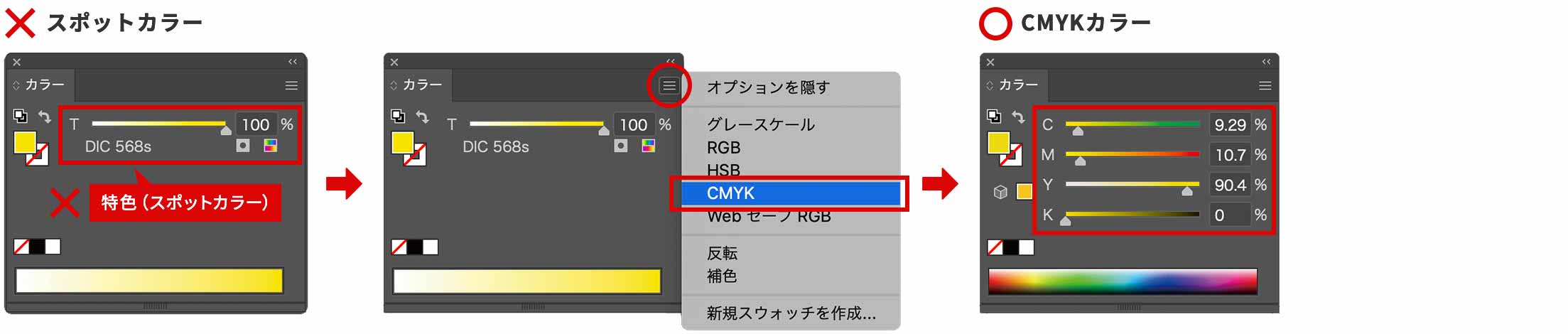 また、DIC・PANTONEなどの特色(スポットカラー)を使用することはできません。CMYK変換をしてください。