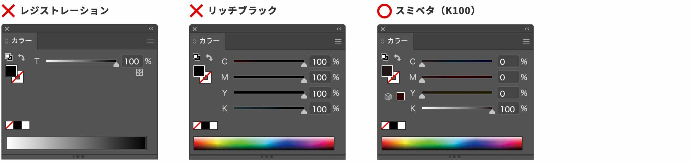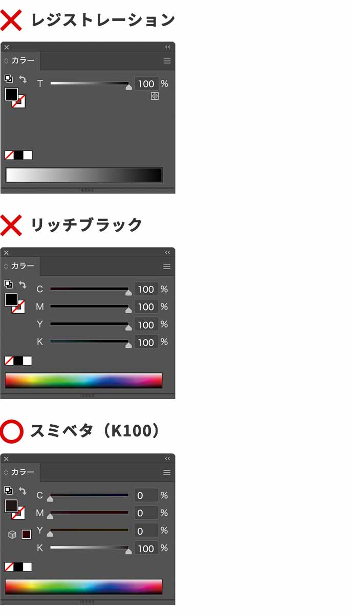 レジストレーションやリッチブラックは、にじみの原因になりますので使用しないでください。