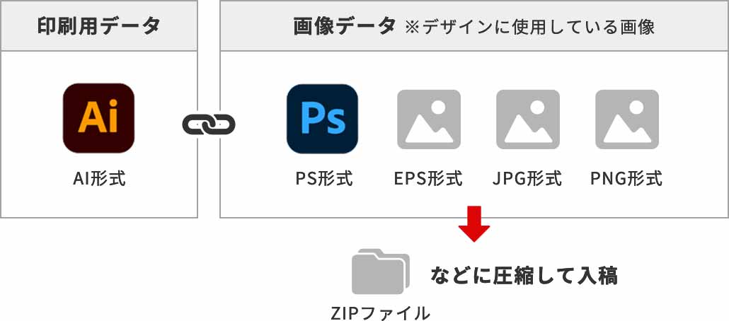 画像ファイルを埋め込みされない場合は、印刷用データと一緒にフォルダにまとめ、圧縮した状態で入稿してください。