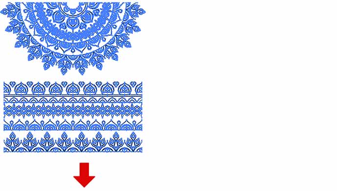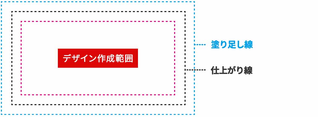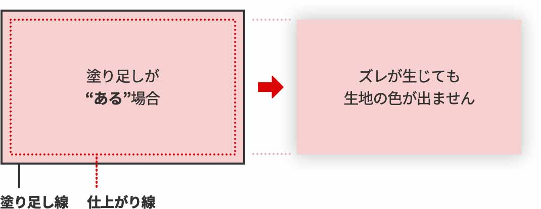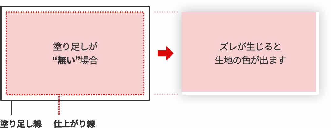 商品の仕上がりには多少のズレが生じる場合があります。仕上がりの端までデザインを印刷する場合、仕上がりサイズより外側に塗り足しが必要になります。テンプレートの塗り足し線まで塗り足しを付けてください。塗り足しを付けることで、端までデザインを確実に生かすことができ、生地の白い部分が出なくなります。