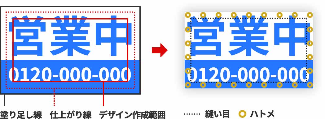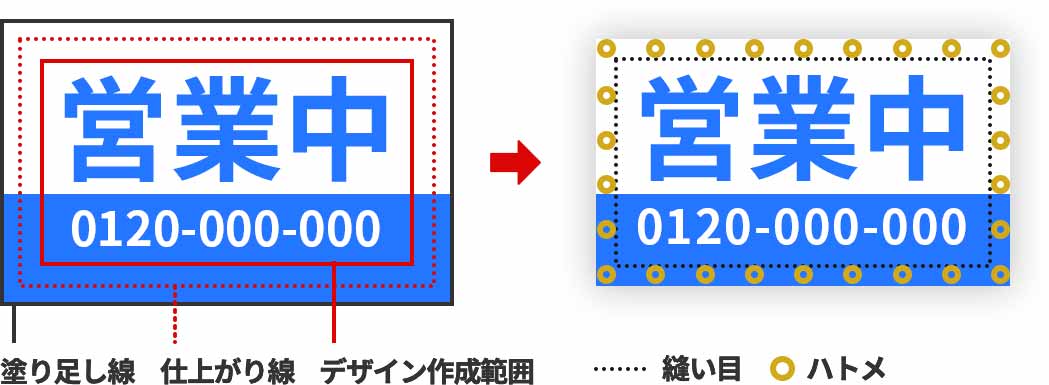 デザイン作成範囲の外側に文字・図柄がある場合、ハトメや縫製の縫い目が重なり、視認性が劣ります。デザインはなるべく、デザイン作成範囲内にレイアウトしてください。