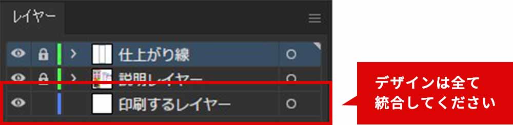 データ作成の際、「印刷するレイヤー」はすべて統合し、1枚のレイヤーにしてご入稿ください。なお、あらかじめ設定されている「仕上がり線」レイヤーと「説明レイヤー」は残したままにし、「印刷するレイヤーと統合しないでください。また仕上がり線やその他のガイドは削除しないでください。