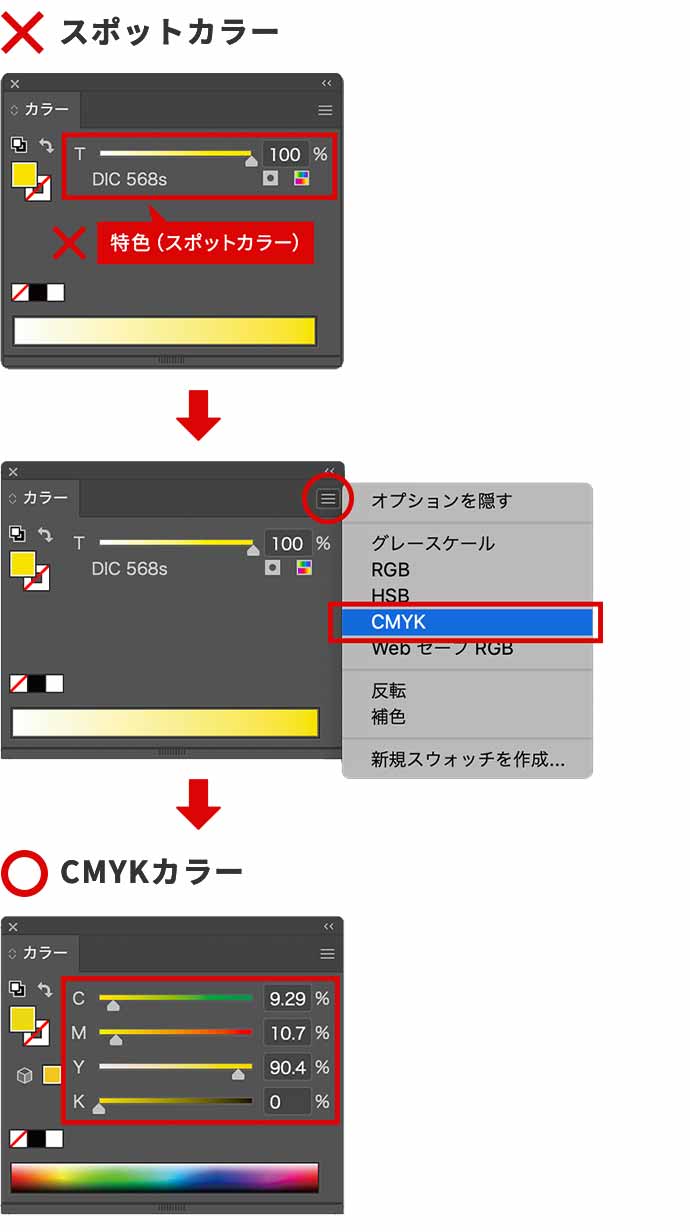 ※RGBで設定されている場合等は、弊社にて自動的にCMYKに変換いたします。