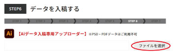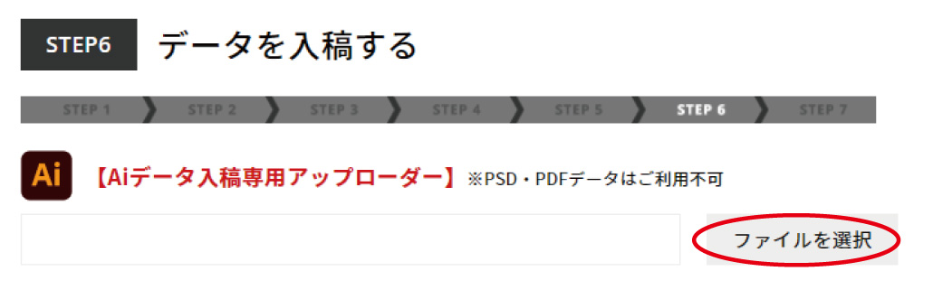 各商品のご購入手続きのSTEPの中に、データを入稿するという項目がありますので、「ファイルを選択」ボタンより Aiデータをご入稿ください。