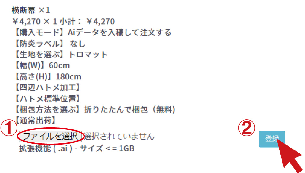 ご購入手続き後、マイページの注文履歴から「ファイルを選択」ボタンを選択し、Aiデータをお選びいただいてから、 登録ボタンを押してファイルをアップロードしてください。